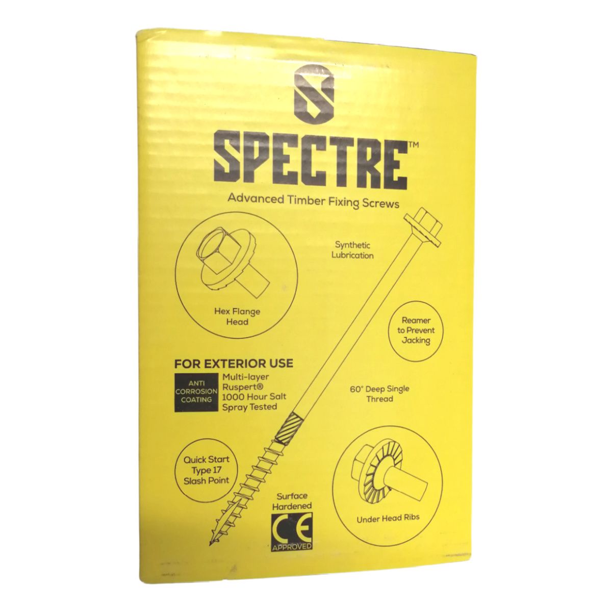 Spectre Advanced hex drive timber bolts. Ruspert anti-corrosion coating with a reamer to prevent jacking and a Type 17 Slash Point.